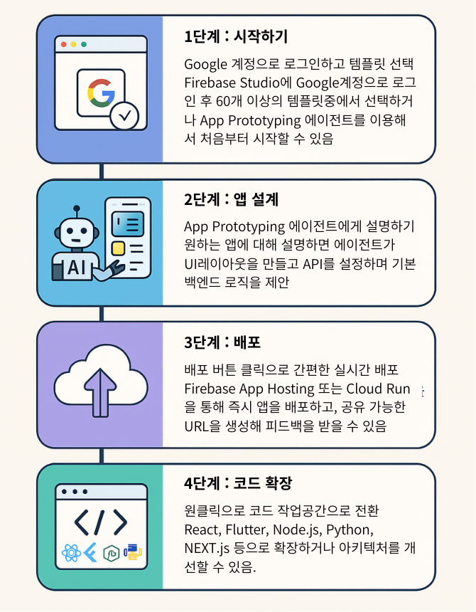 이 두 방식 간에 자유롭게 전환하면서 각 접근법의 장점을 활용할 수 있다는 것이 Firebase Studio의 가장 큰 강점입니다.